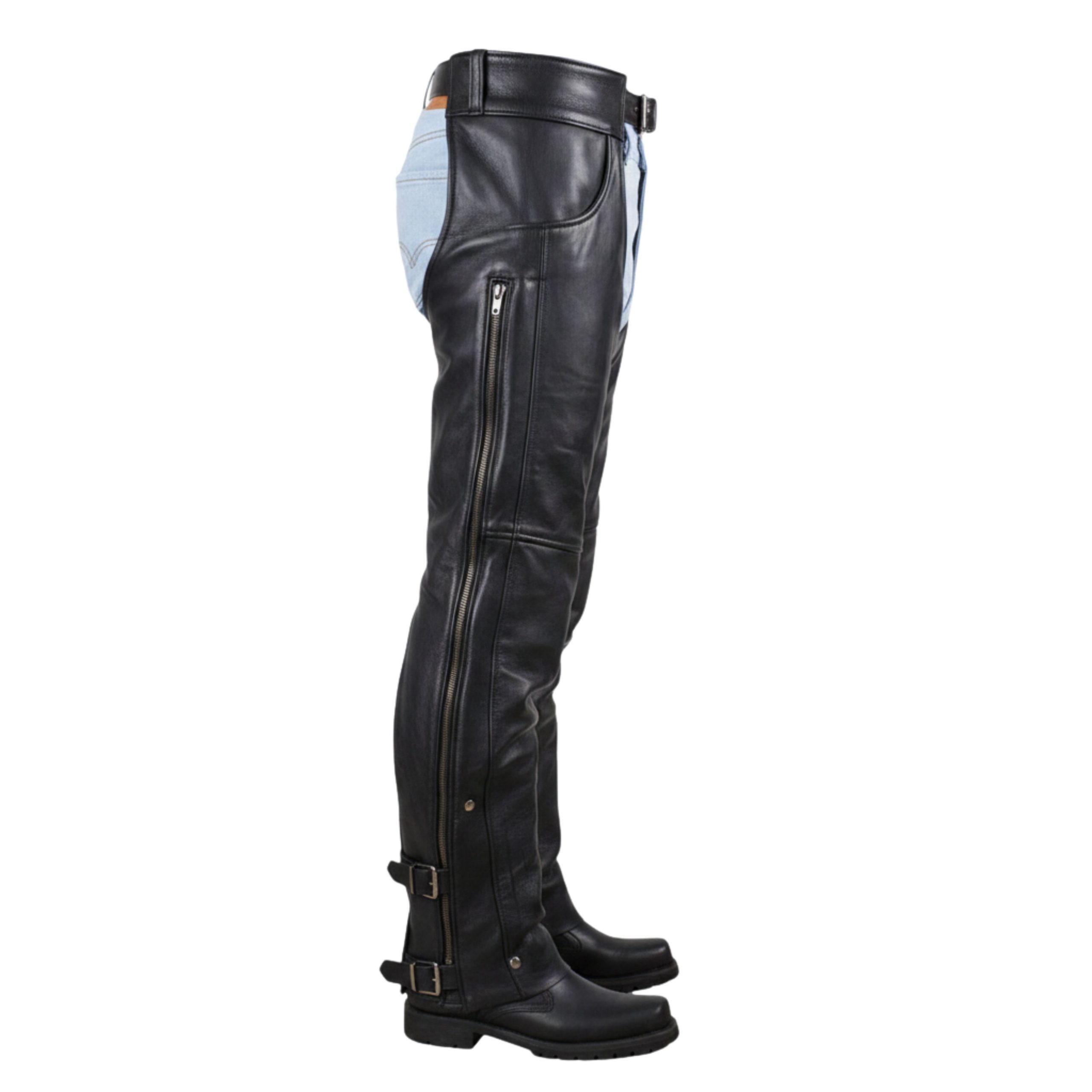 The Allstate Leather Motorcycle Chaps from Leather Chapo’s esteemed Mens Leather Motorcycle Chaps collection. These chaps are meticulously crafted from premium cowhide leather, renowned for its durability and resistance to wear and tear. Designed with the modern rider in mind, they feature adjustable straps and zippers for a customizable and secure fit
