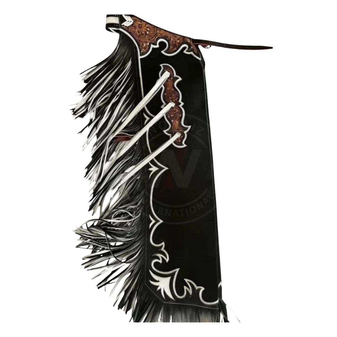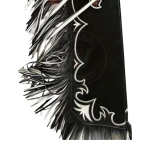 Experience the perfect blend of craftsmanship and performance with the Black Canyon Tooled Rodeo Chaps with Fringe. These chaps feature beautifully hand-tooled leather yokes paired with an eye-catching black base and white embroidered accents. The bold, layered fringe adds dramatic movement, making every ride visually impressive. Crafted from high-quality, durable leather, these chaps ensure long-lasting protection, flexibility, and comfort in the arena. With adjustable buckle straps and strong construction, they’re designed for rodeo riders who demand both style and reliability.
