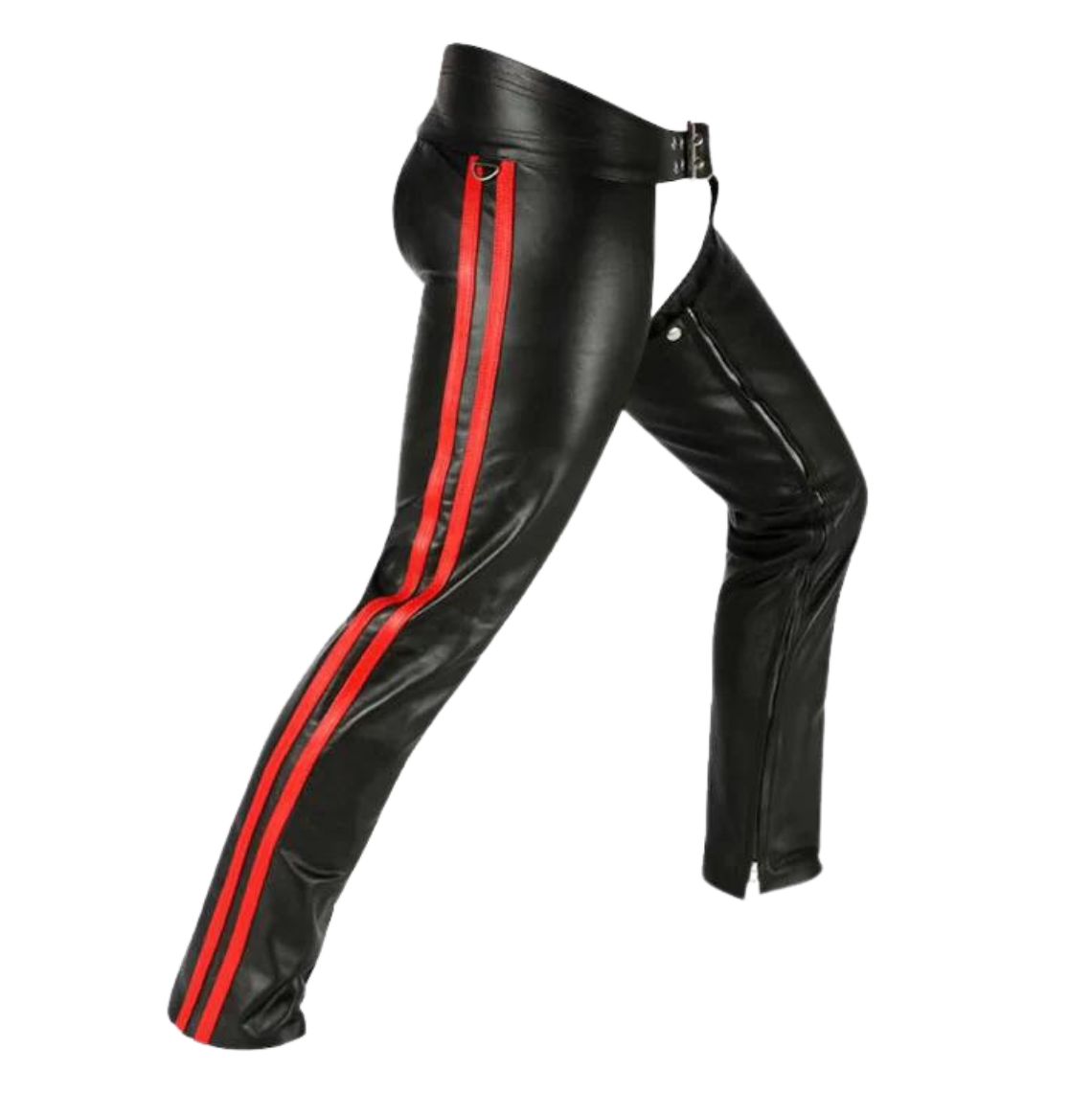 Crafted from premium black leather, these chaps offer durability and flexibility, ensuring long-lasting wear. The sleek red stripe detailing along the legs adds a striking contrast, enhancing the aesthetic appeal. The full-length zippers on the sides provide easy wearability, while the adjustable belt closure guarantees a secure fit. Perfect for motorcycle riding, clubwear, or fashion-forward events, these chaps are more than just gear – they are a symbol of confidence and individuality.