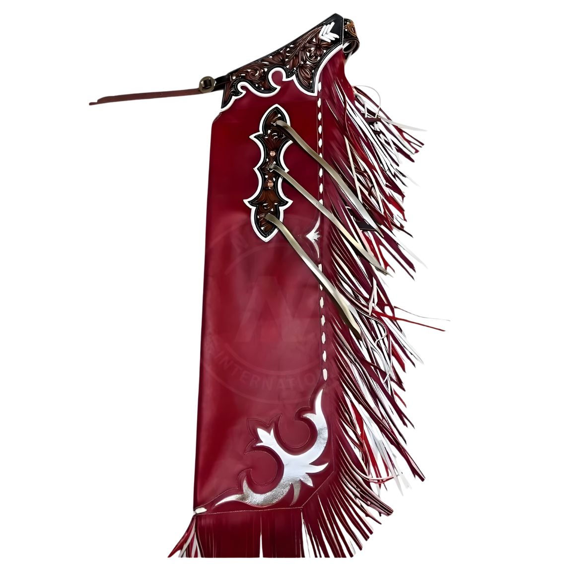 The Elite Rodeo Chaps with Tooled Panels and Fringes feature a striking red design, beautifully hand-tooled panels, and long layered fringe for maximum arena impact. Made from premium leather, they offer durability, comfort, and a secure adjustable fit. Ideal for riders who want top-tier performance with show-stopping western style.