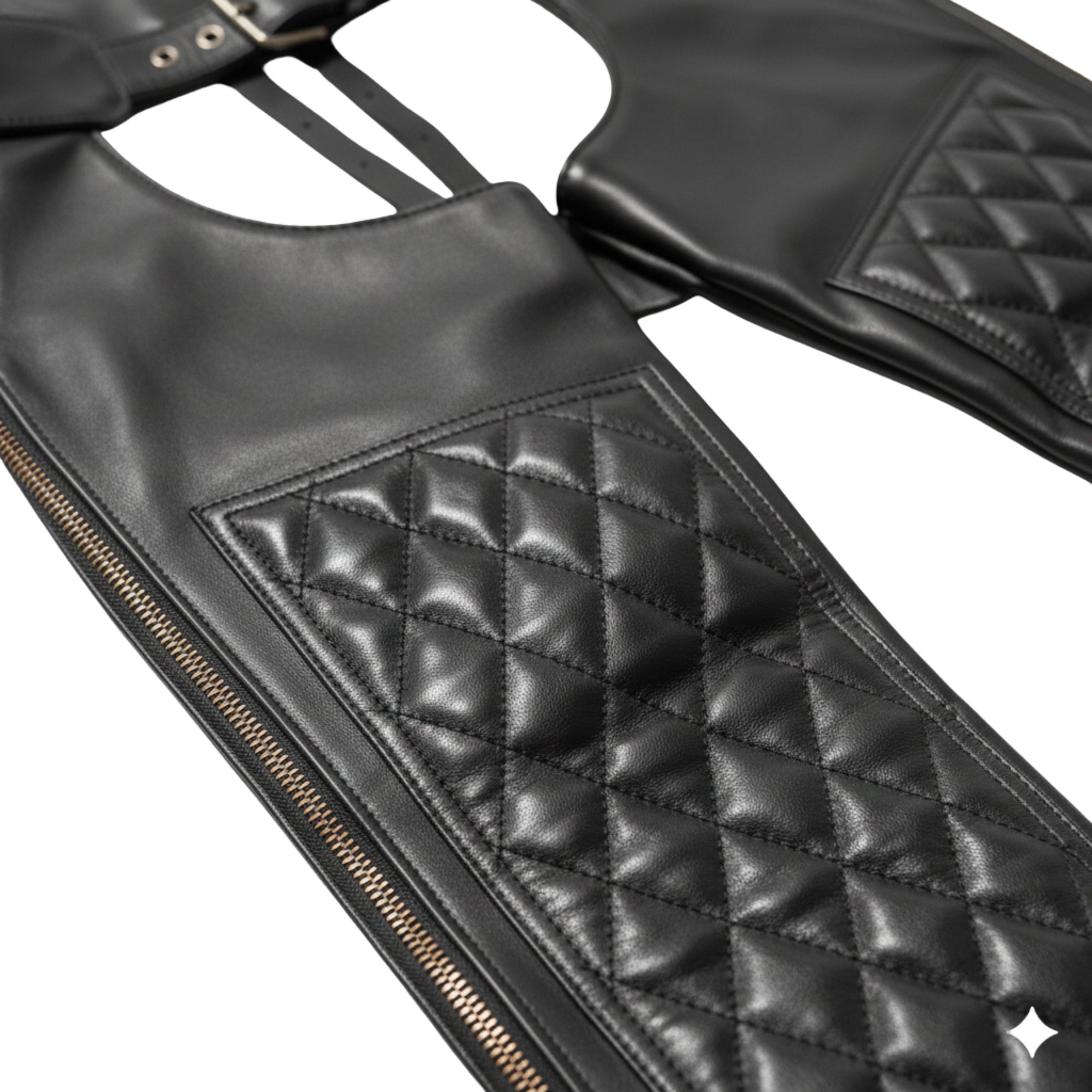 The Midnight Rider Ventilated Assless Chaps offer rugged style, superior comfort, and durability. Featuring premium leather, quilted panels, and ventilation, they ensure breathability & flexibility for bikers and Western riders. Perfect for long rides & ultimate protection.