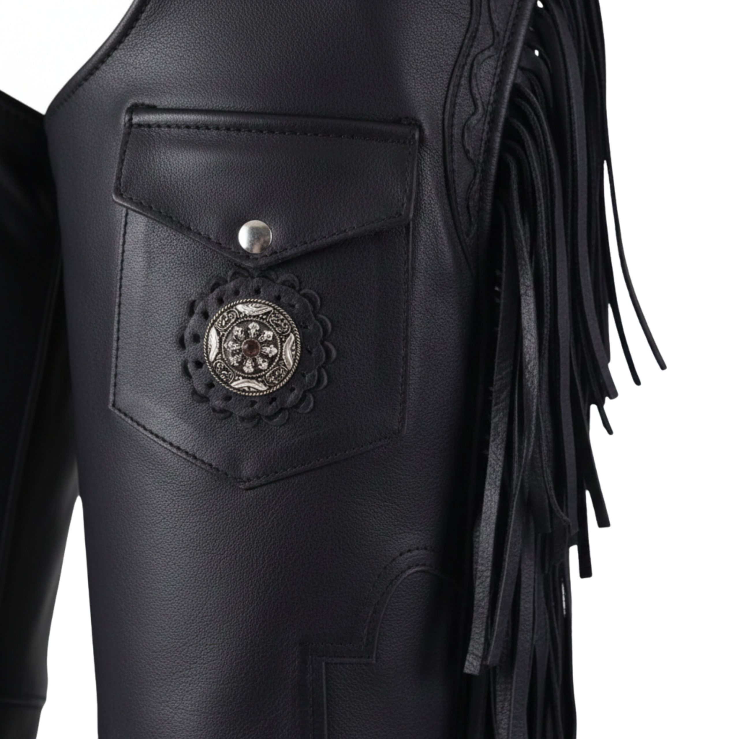 Fringe: Long leather fringe down both legs for western movement