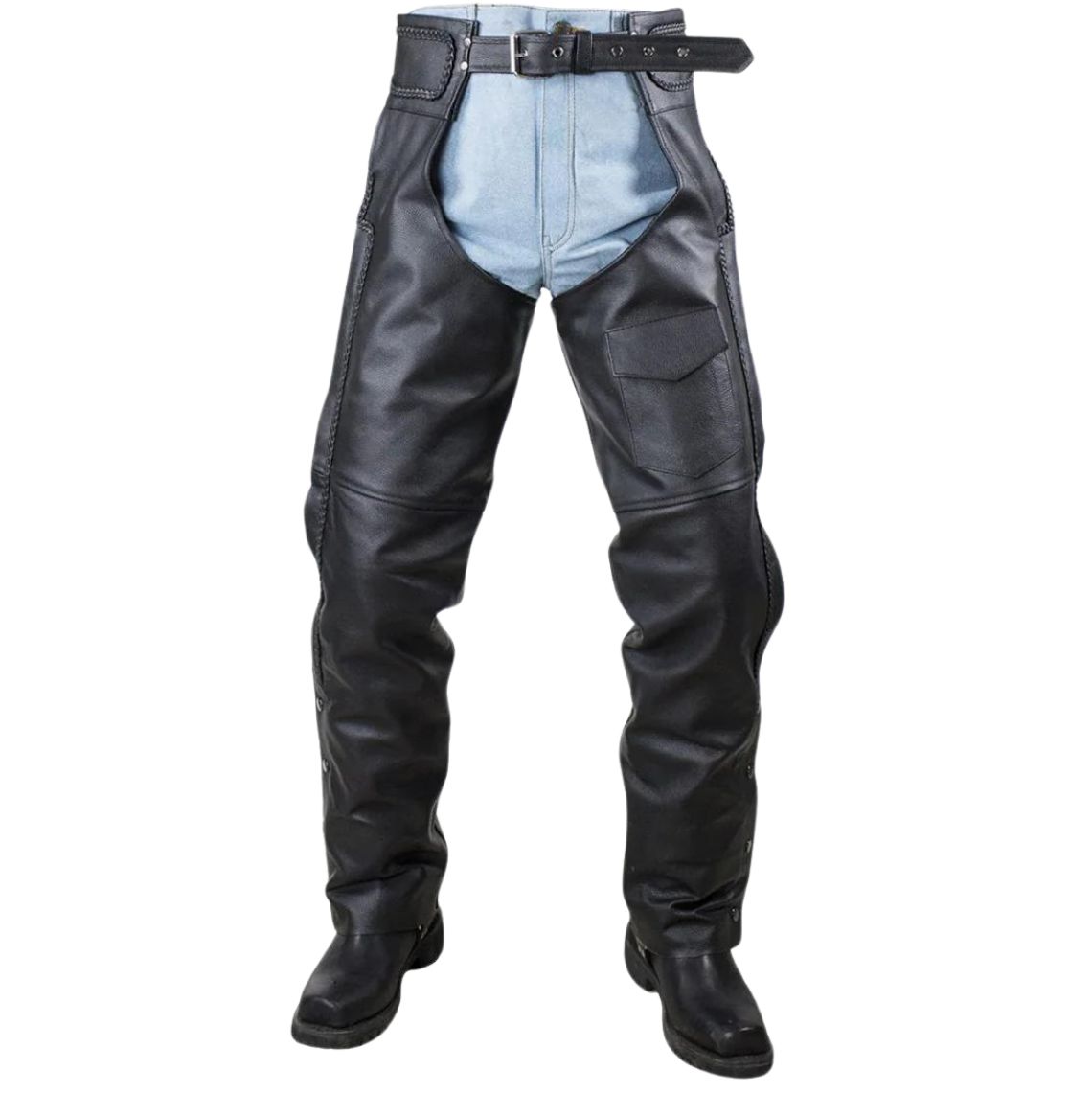 Crafted from high-quality black leather, these chaps feature an adjustable belt for a secure fit, a spacious side pocket for easy storage, and reinforced stitching for long-lasting performance. The full-length side zippers make them easy to wear over jeans, while the snap closures at the bottom ensure a snug fit around your boots. Whether you’re a daily rider, weekend warrior, or long-haul traveler, these chaps deliver exceptional protection and timeless biker style.