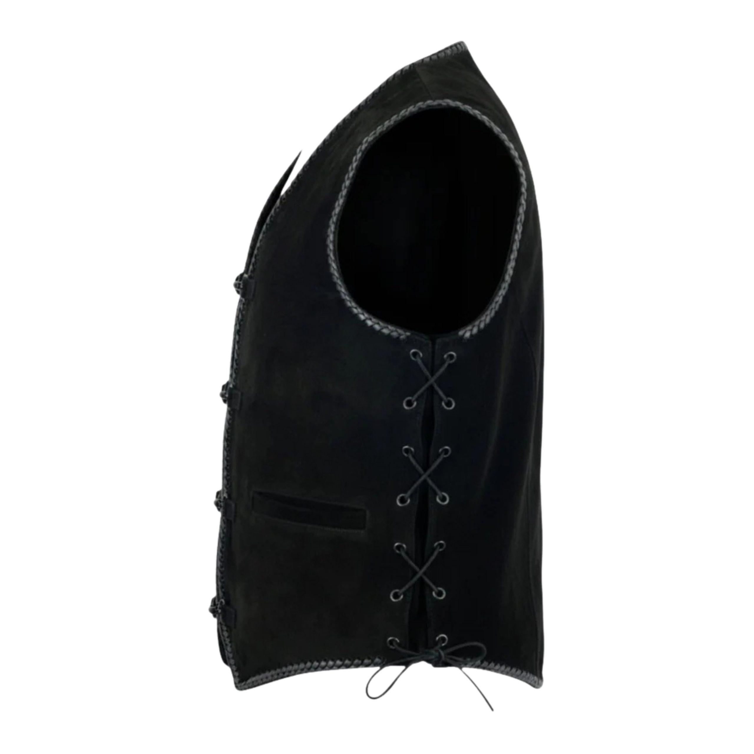 Add rugged style to your wardrobe with our Premium Black Suede Western Vest. Featuring side laces, hook front closures, and a soft suede finish for comfort and timeless Western appeal.