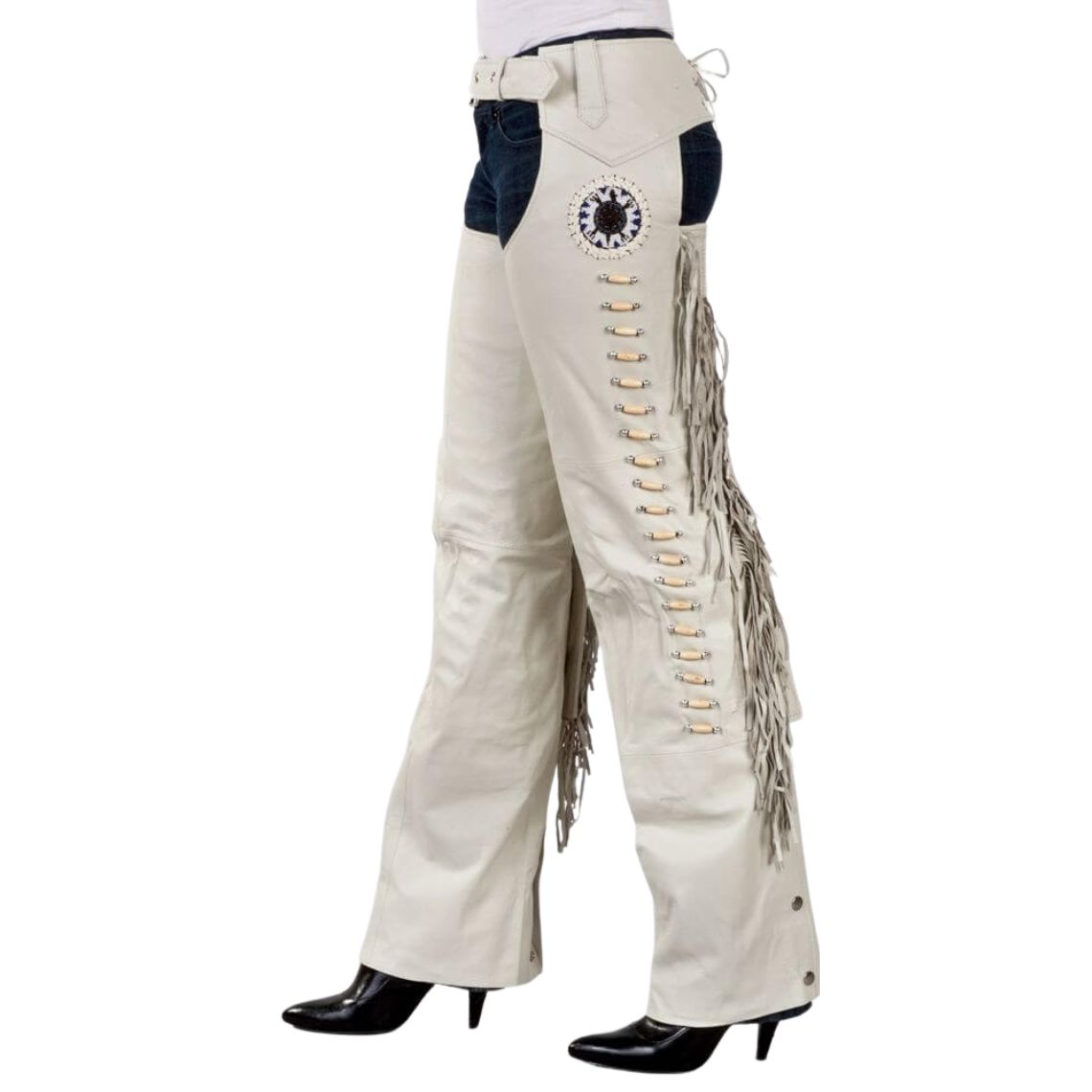 These white chaps are both stylish and practical. The leather is smooth and tough, while the fit is just right. They make me feel confident while riding.