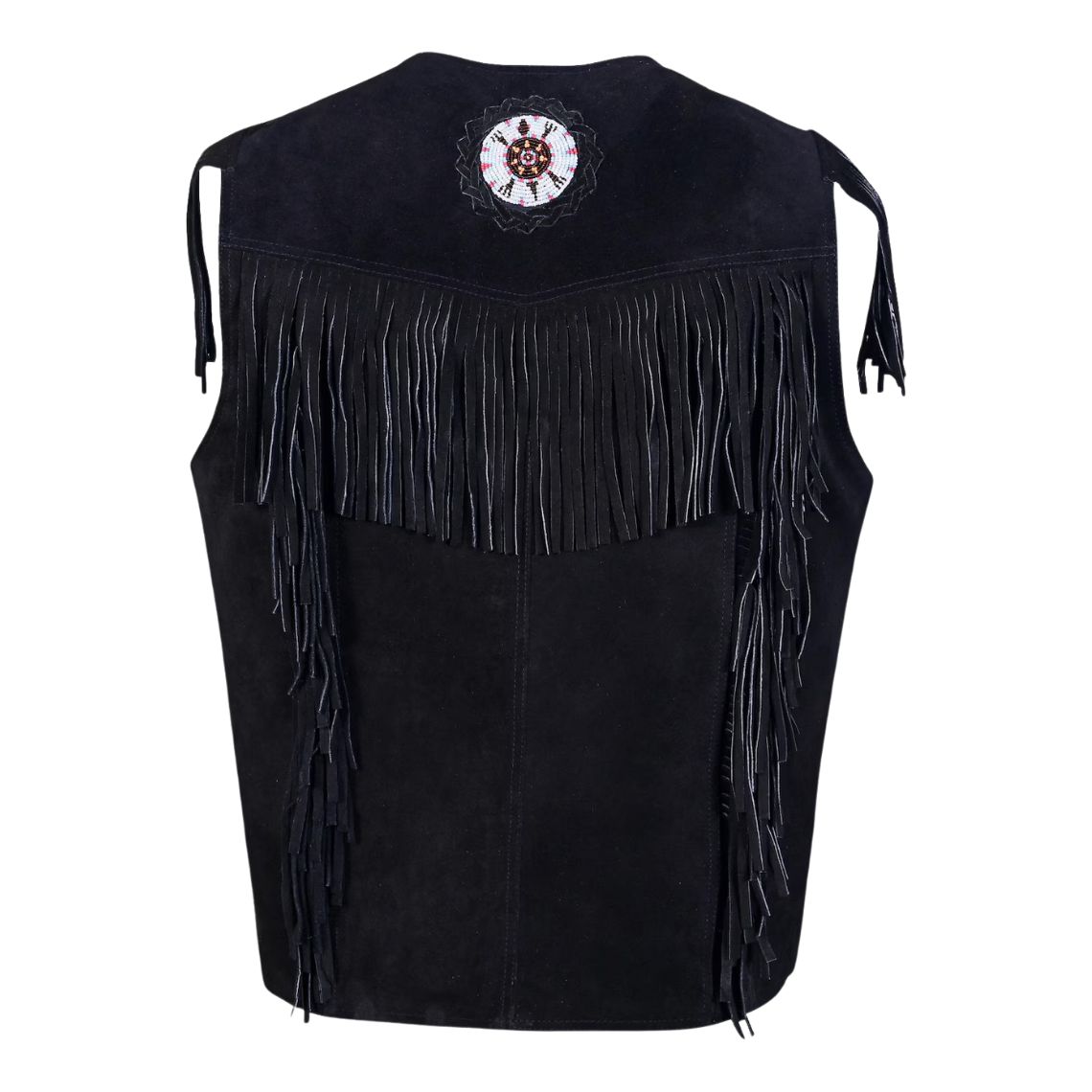 Stand out in the Suede Leather Western Vest with Beaded Fringe. Designed with bone detailing, fringe accents, and hand-beaded medallions for a true western look.
