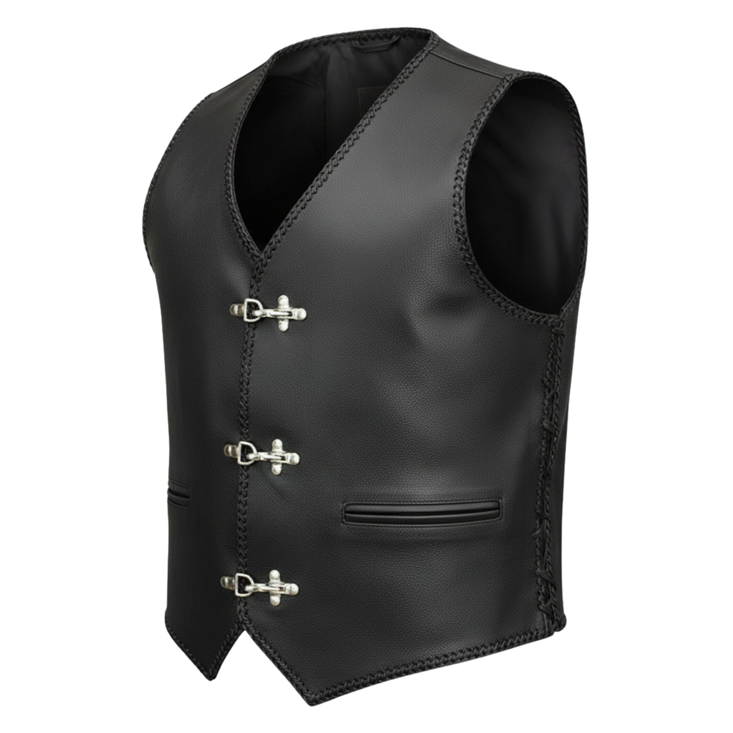 The Timeless Hook Closure Leather Riding Vest brings classic biker heritage and modern refinement together in one versatile piece. Made from high-quality, durable leather, this vest showcases traditional craftsmanship with its intricate braided edges and signature metal hook closures that exude vintage charm.