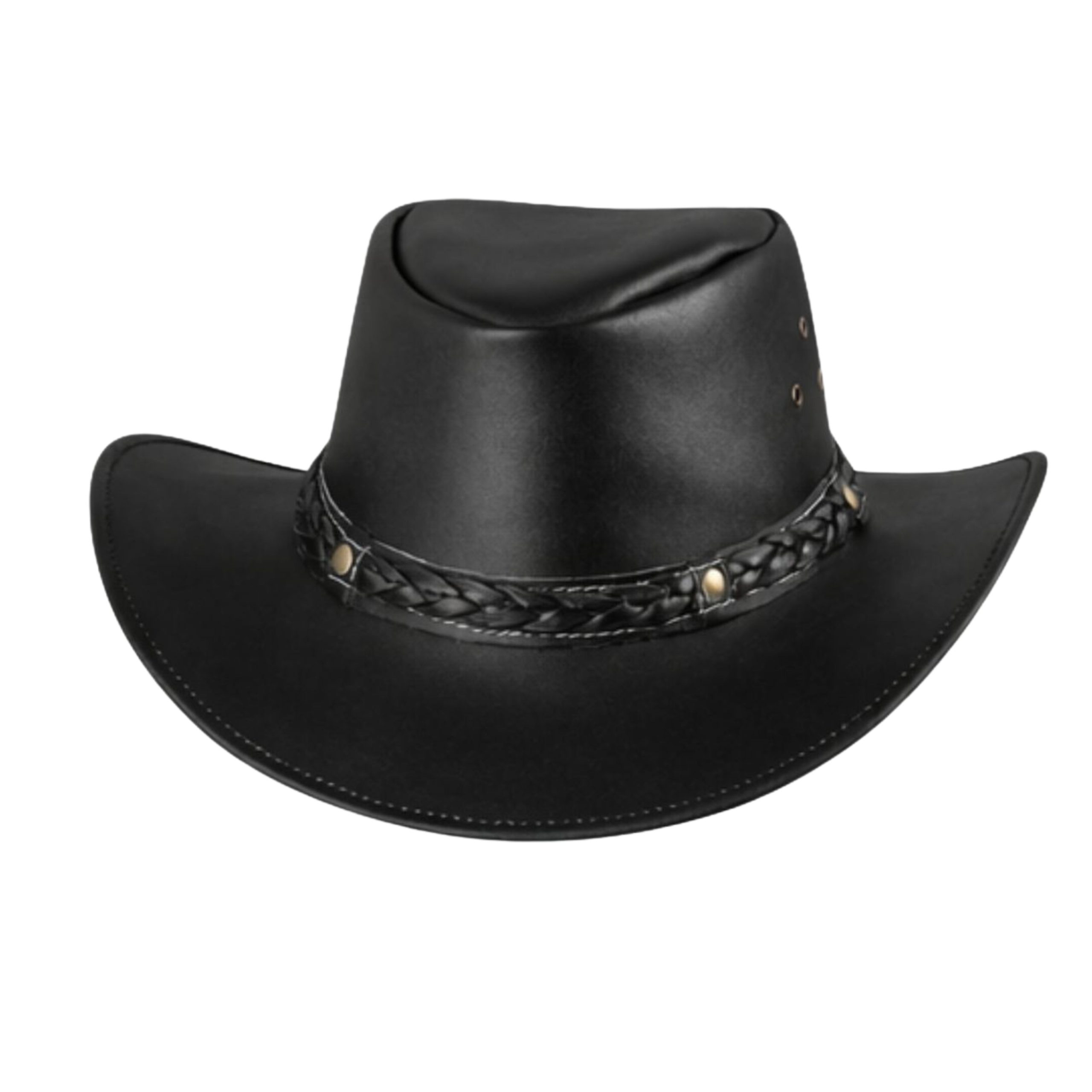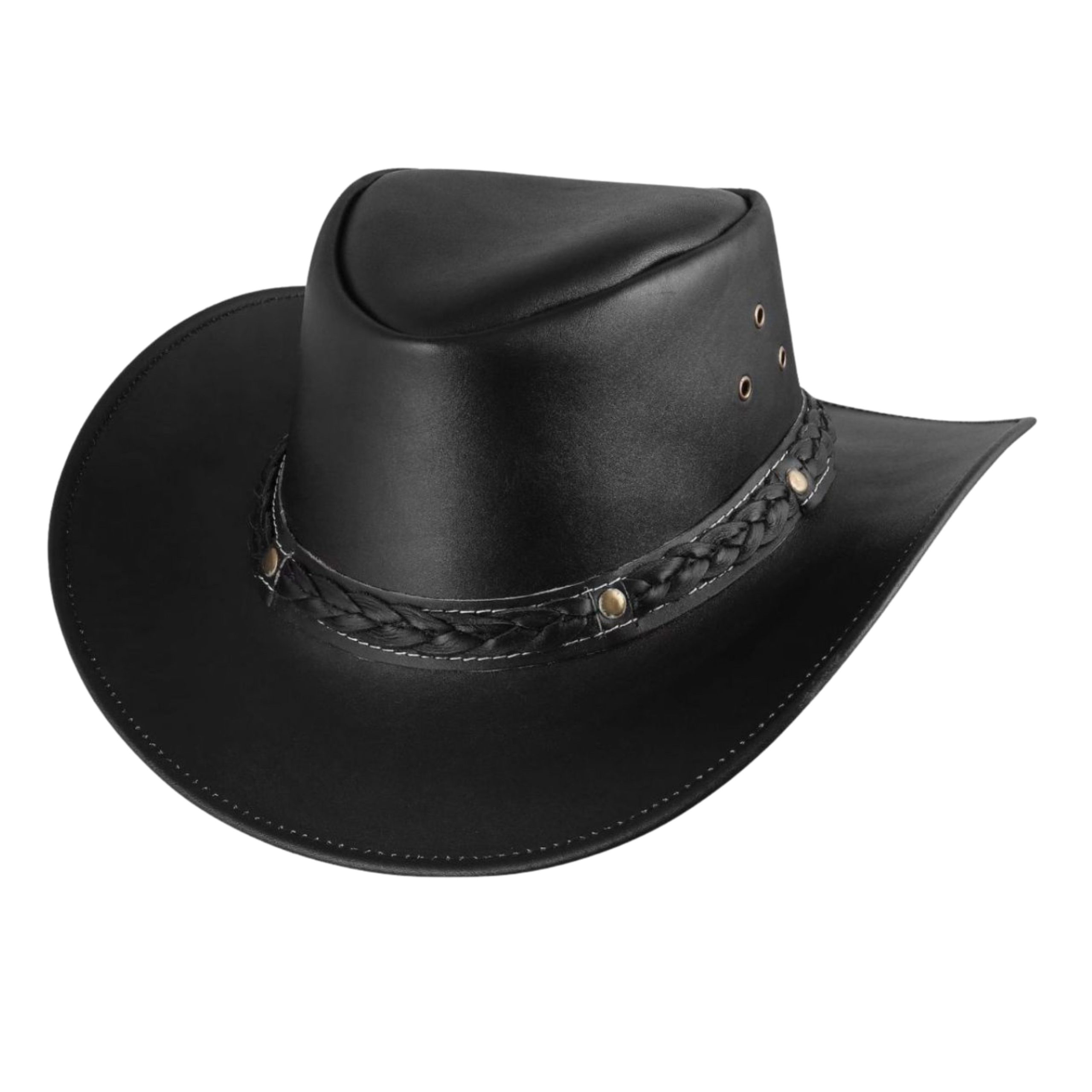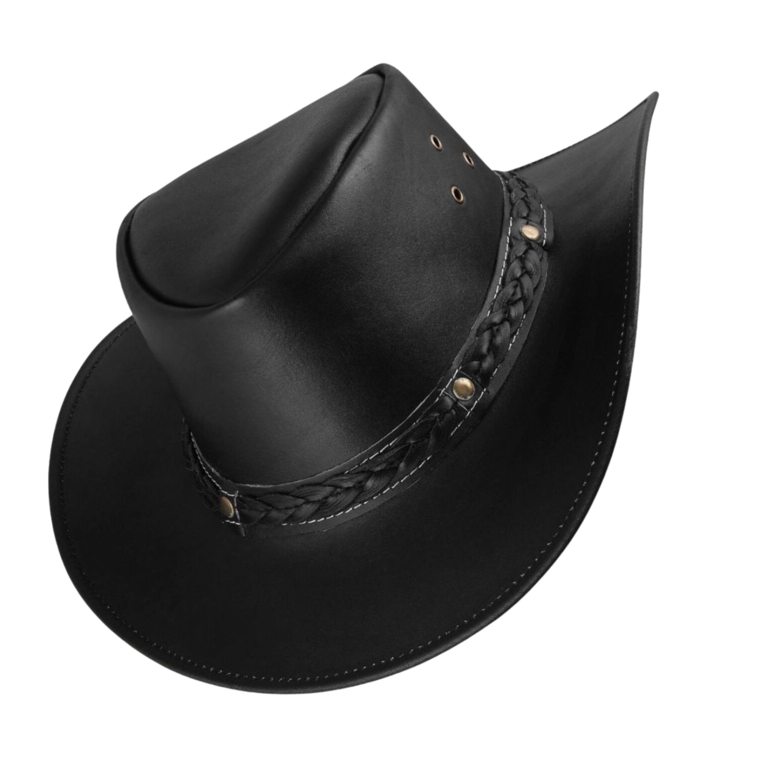 The wide-brim design offers sun protection while maintaining a traditional silhouette. The braided leather band, accented with metallic studs, adds a rugged charm that completes the classic cowboy look. With durable stitching and ventilated eyelets for breathability, this hat is as practical as it is iconic.