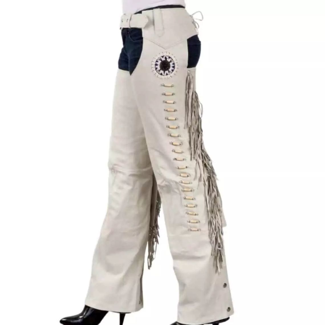 White Western Show Chaps with Fringe Crafted for style and performance, these premium chaps offer a perfect fit, durable construction, and eye-catching fringe for a classic western look. Ideal for rodeos, horse shows, and competitions!